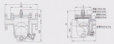 該閥利用浮力原理,浮球根據凝結水量的多少隨水位的變化而作升降,目動調節閥座孔的開度,連續排放凝結水。當凝結水停止進入時,浮球靠自重降到底部,關閉排水閥孔。由干排水閥座孔在凝結水位以下,水汽自然分離,形成水封,達到無蒸汽泄漏。